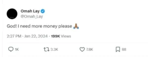 Nigerian musician and songwriter, Stanley Omah Didia has tweeted his needs this new year, in January 2024, Omah Lay shared a post on his Twitter account expressing his financial status and asking God for more money.